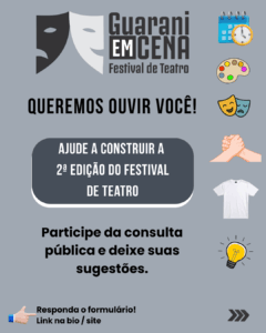 Depois do grande sucesso da primeira edição do Guarani em Cena | Festival de Teatro, a equipe do Teatro de Câmara de Guarani já começa a olhar para o futuro e quer fazer isso junto com você.