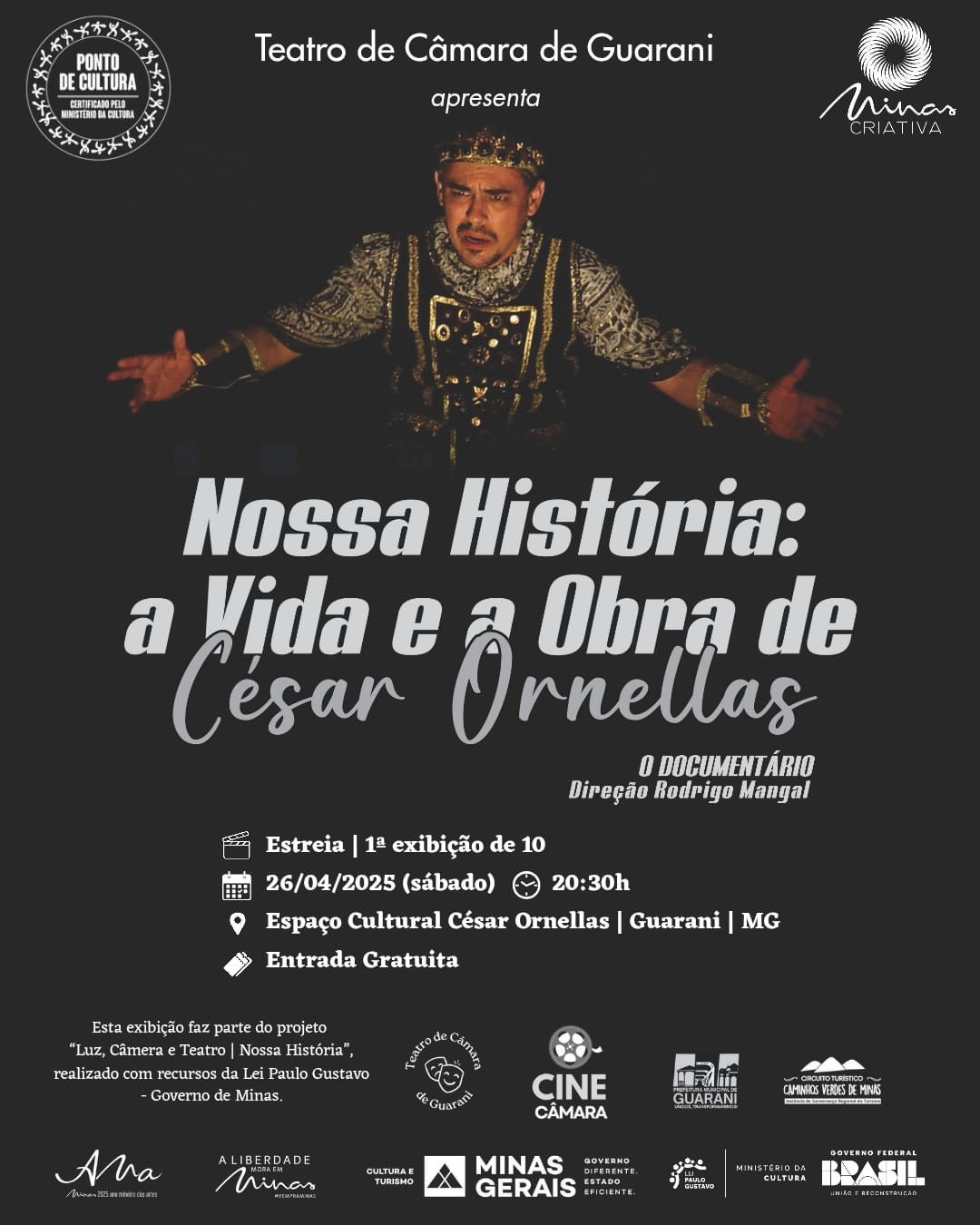 Teatro de Câmara César Ornellas Rua Benedito Valadares l, S/N - Centro, Guarani, MG, BrazilUm momento único de homenagem, memória e emoção, para celebrarmos juntos o legado de quem transformou a cultura da nossa cidade. A entrada é gratuita! Se puder, venha com a gente viver esse momento inesquecível! E se sentir no coração, nos ajude a divulgar, compartilhe o cartaz nos seus stories do whatsApp ou instagram e […]