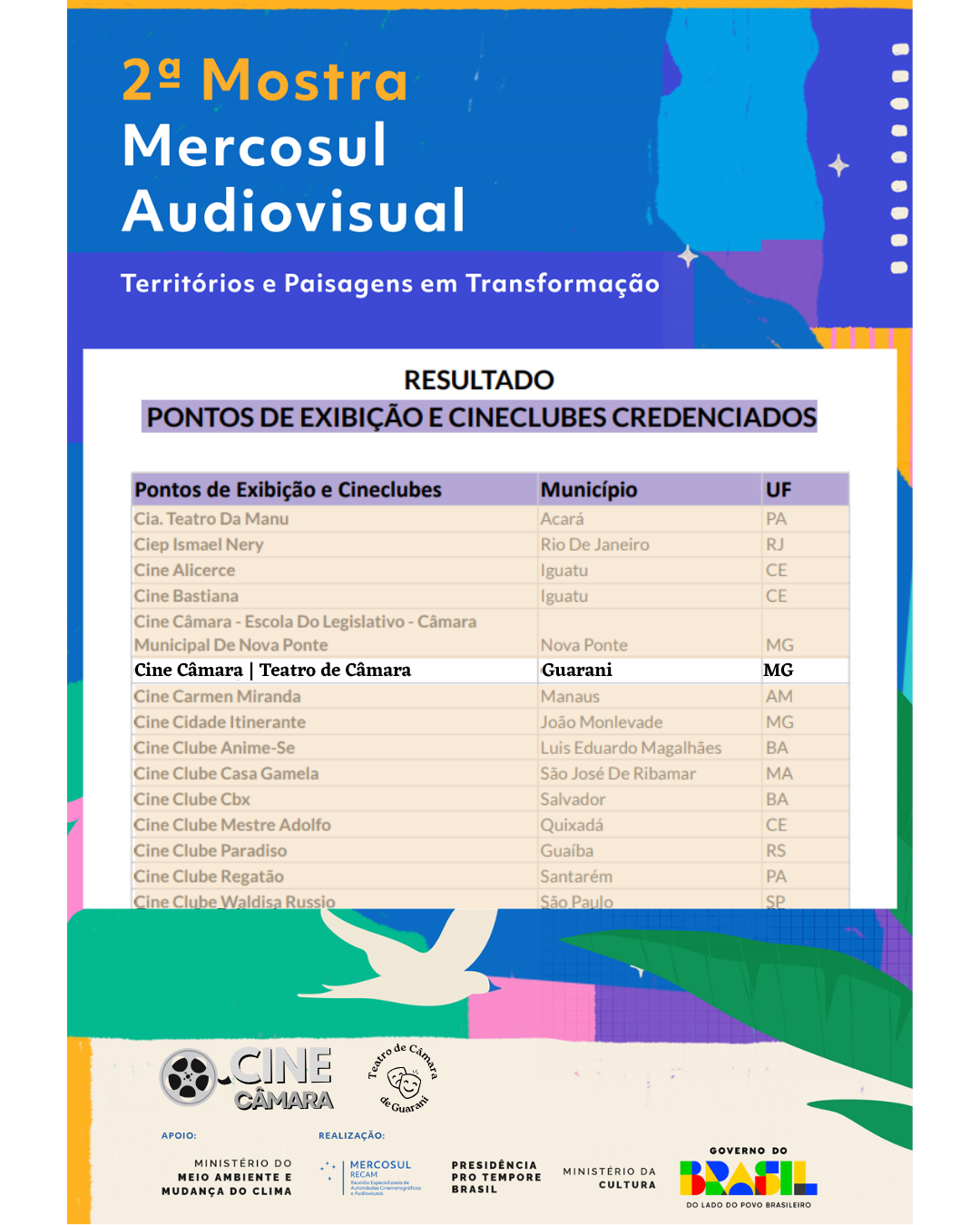 Guarani (MG) – O Cine Câmara, mantido pelo Teatro de Câmara de Guarani, foi novamente selecionado como Ponto de Exibição Credenciado da 2ª Mostra Mercosul Audiovisual, promovida pela Recam (Reunião Especializada de Autoridades Cinematográficas e Audiovisuais do Mercosul), em parceria com o Ministério da Cultura (MinC).